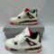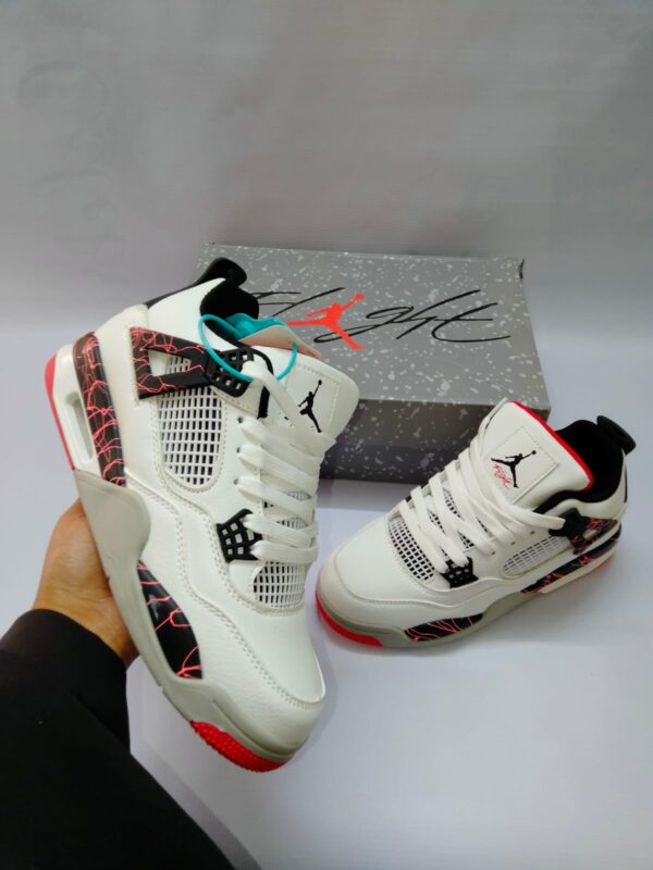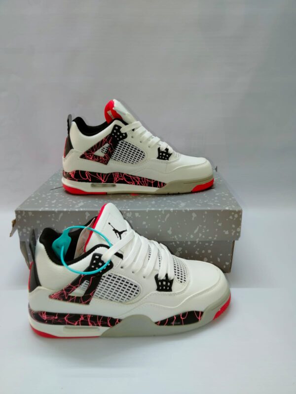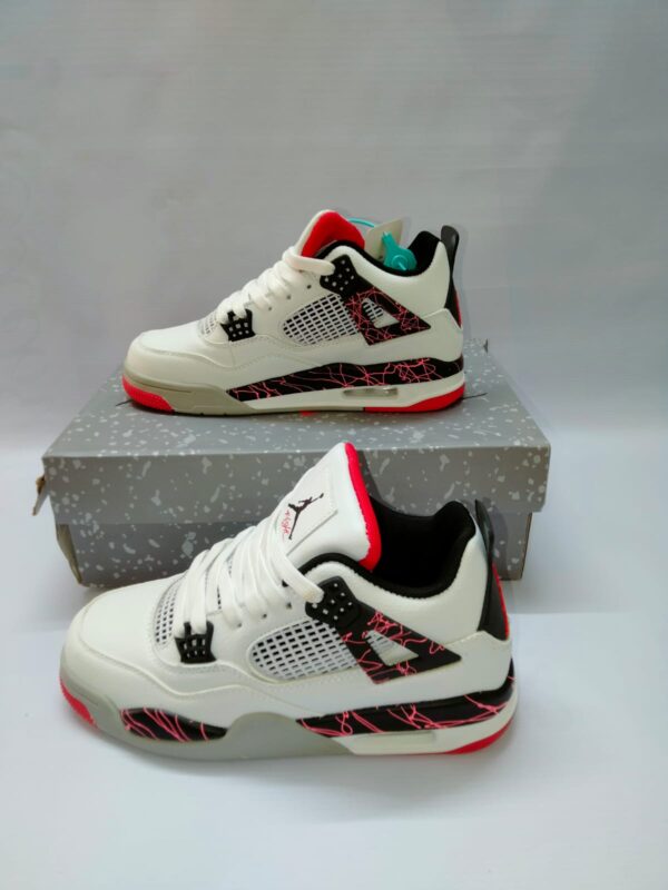 The Air Jordan 4 Retro “Flight Nostalgia” features a clean white tumbled leather upper with striking black and bright crimson accents. The standout detail is the multicolored speckled pattern on the midsole, wings, and heel in bright crimson, pale citron, and turquoise tones, giving the shoe its signature “Flight Nostalgia” look. Finished with a red-tinted translucent outsole and classic Jumpman branding on the tongue and heel, this 2019 release (originally a grade-school exclusive) remains one of the most vibrant and sought-after Air Jordan 4 colorways.
